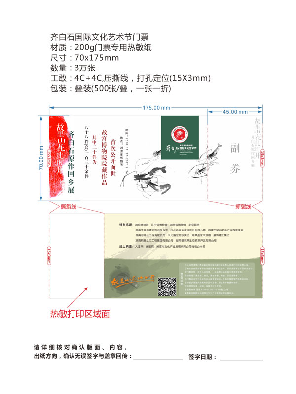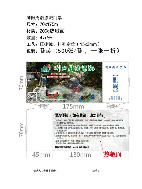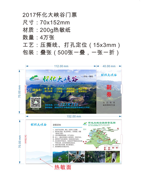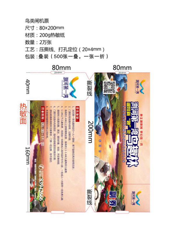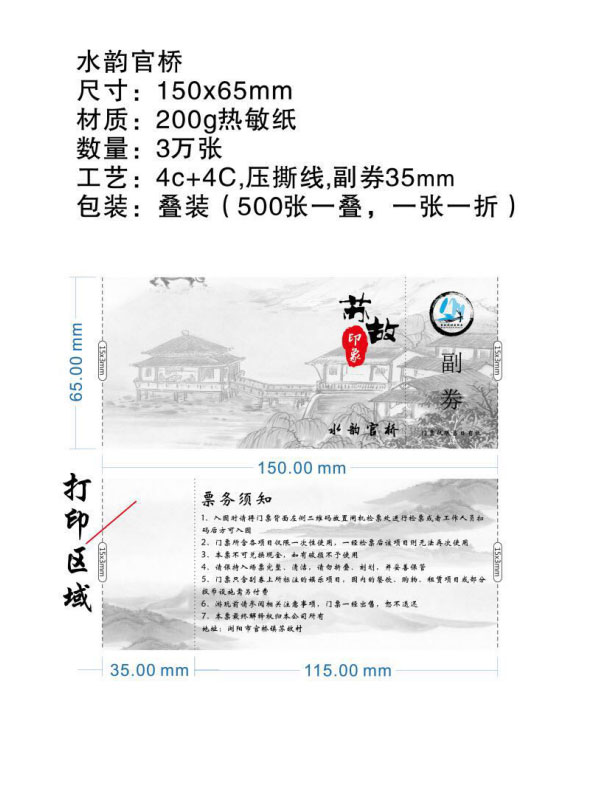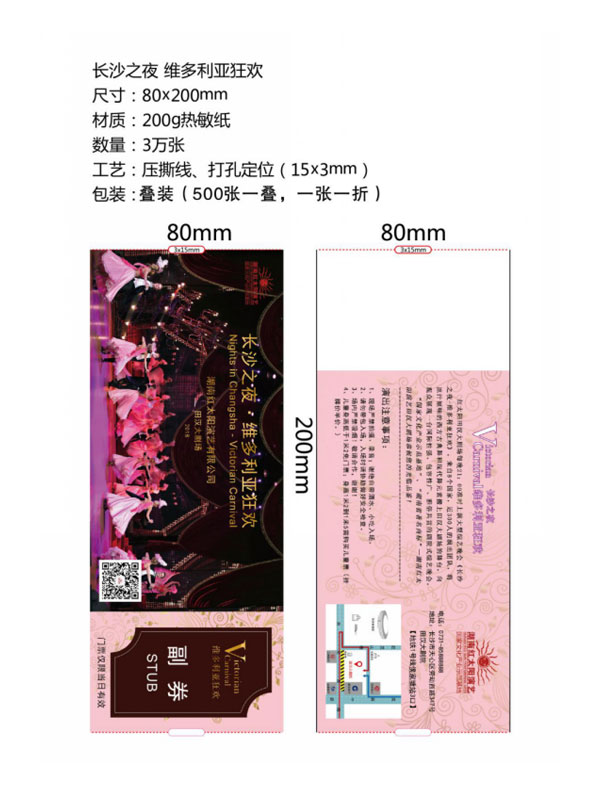 印刷工藝:卷裝門票、折疊門票、撕線(每張之間的撕線,正副券之間的撕線)、定位(孔位定位,黑標(biāo)定位)、流水號碼(序列號,度亂碼)、可變數(shù)據(jù)(可變二維碼,可變條碼等)。